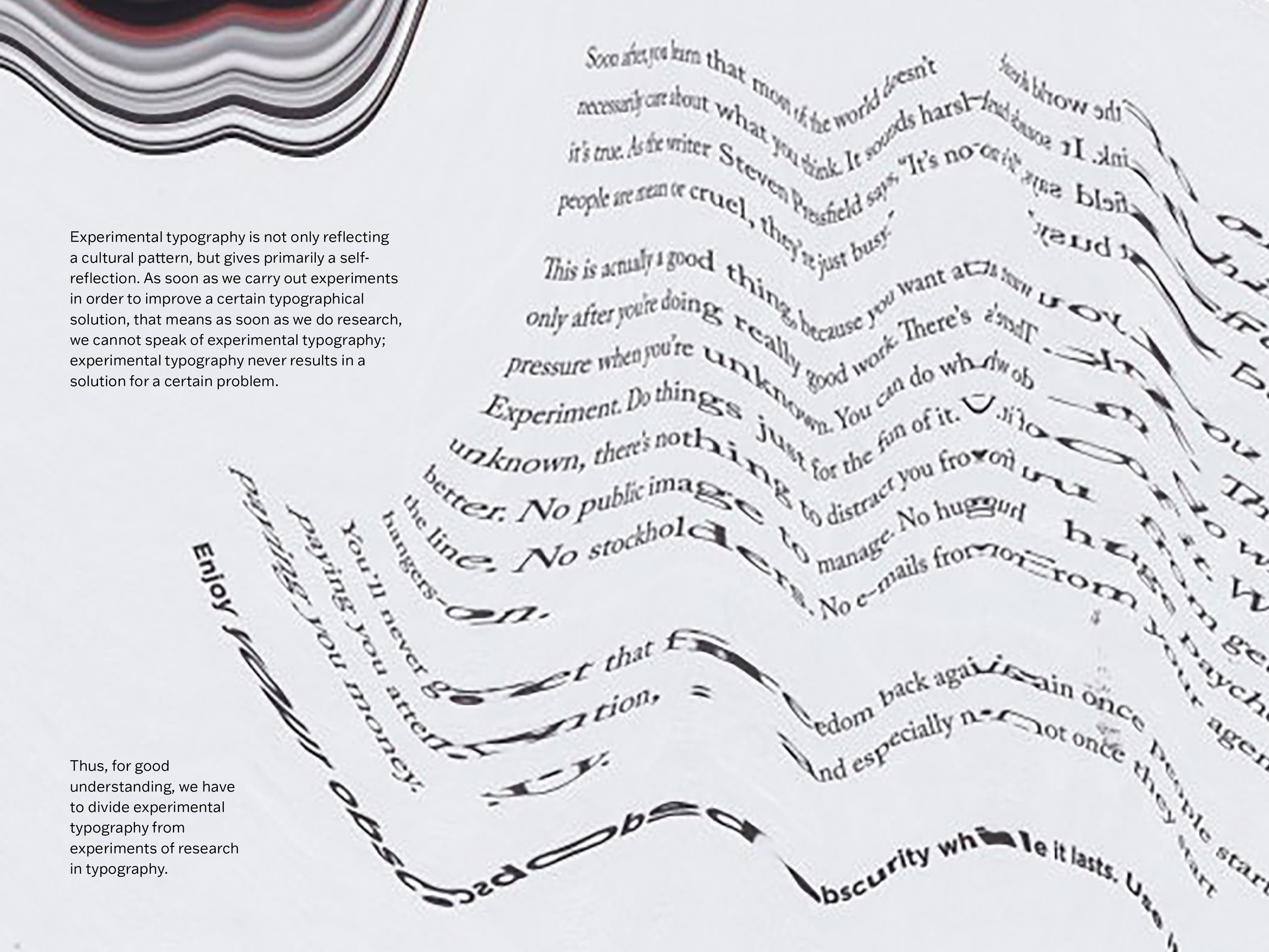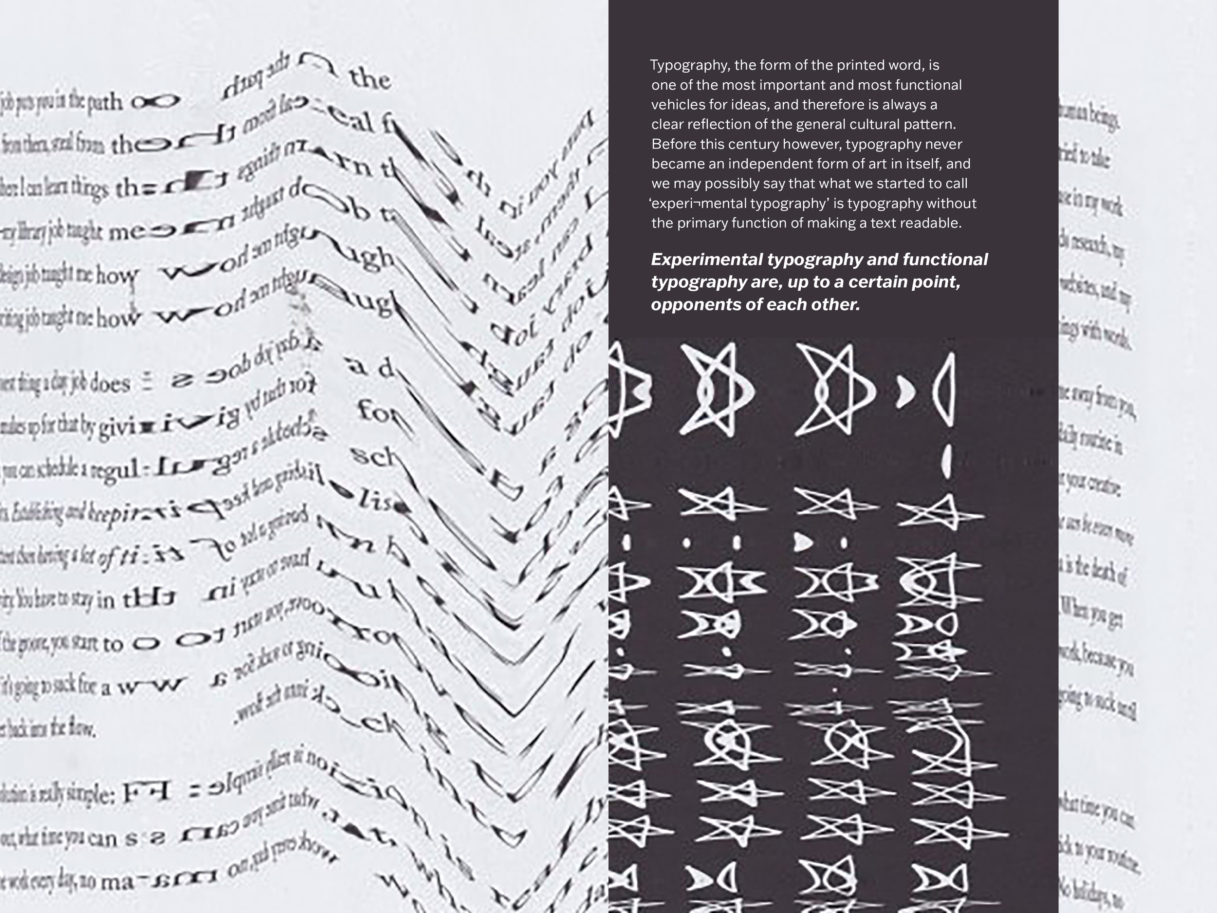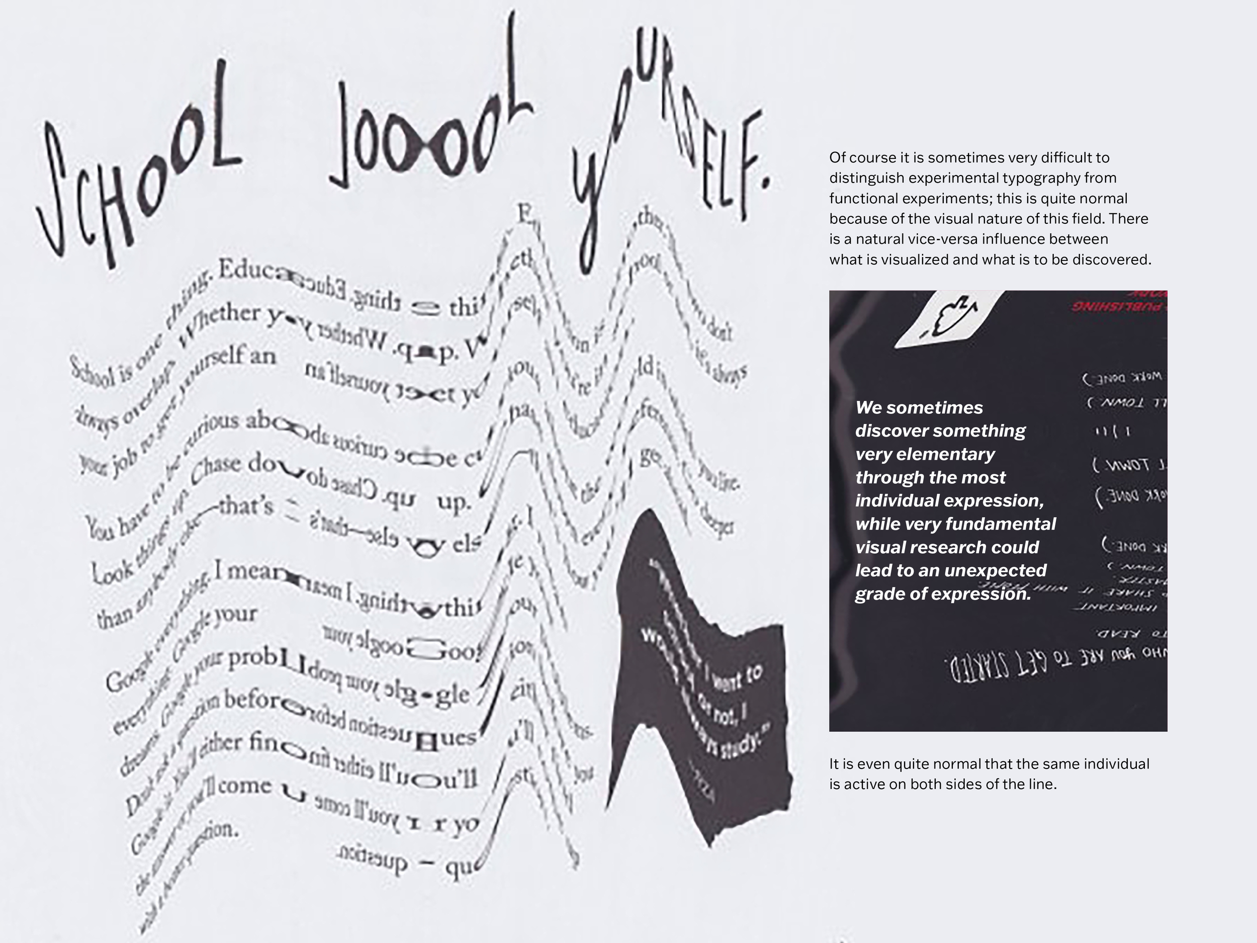 “Experimental Typography and the Need for the Experiment” was published by Dutch graphic designer Wim Crouwel in the special 1980 edition of Idea Magazine, Typography Today. Crouwel specialized in experimental typographic design, and his “Experimental Typography” article argues that experimentation is necessary in design. He asserts that experimentation for expression should be separated from experimentation for functional research, but clarifies that the exploration of one pathway can lead to solutions for the other.