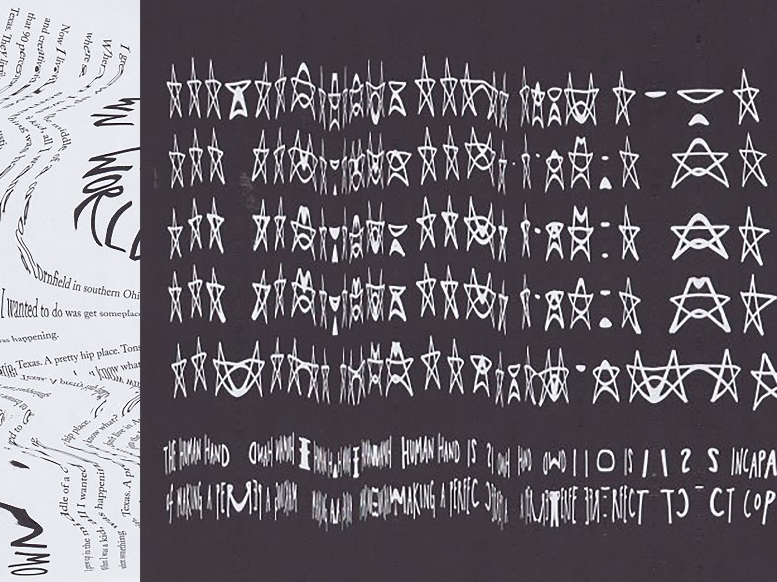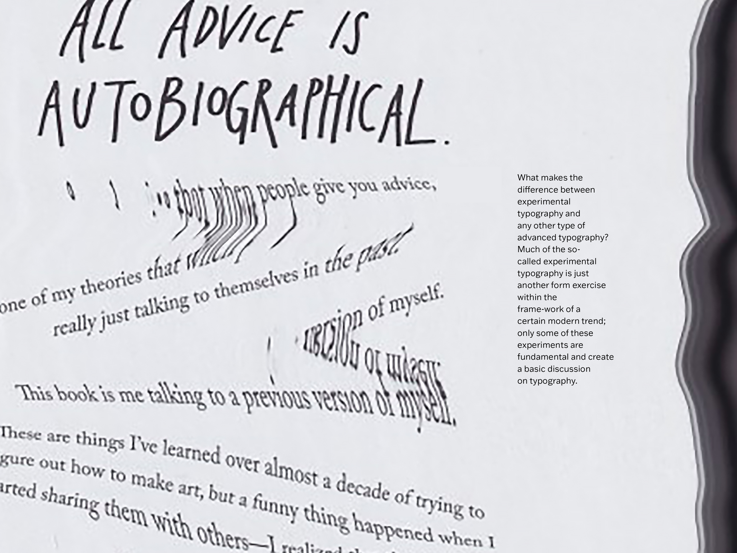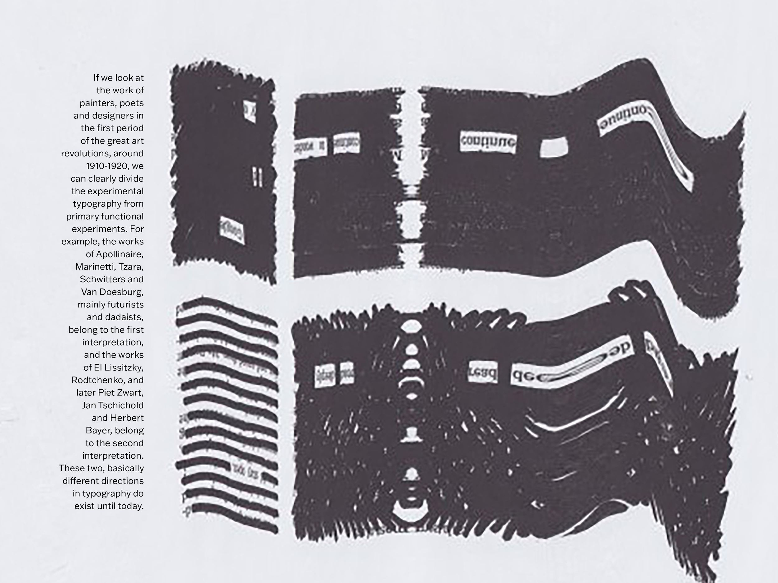 This booklet contains the Wim Crouwel essay, “Experimental Typography and the Need for the Experiment.” The straightforward type used for the article juxtaposes the experimental type used as graphic elements. The experimental type was generated by scanning pages of Steal Like an Artist by Austin Kleon, with the distortions created by moving the book during the scan.