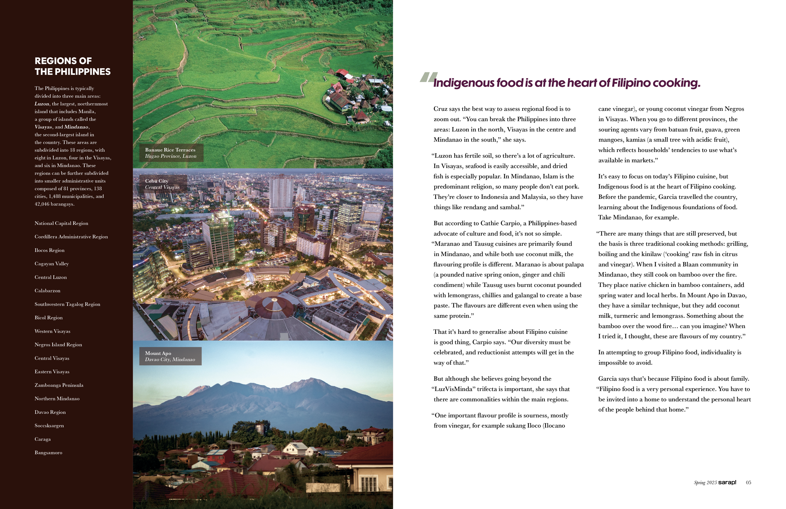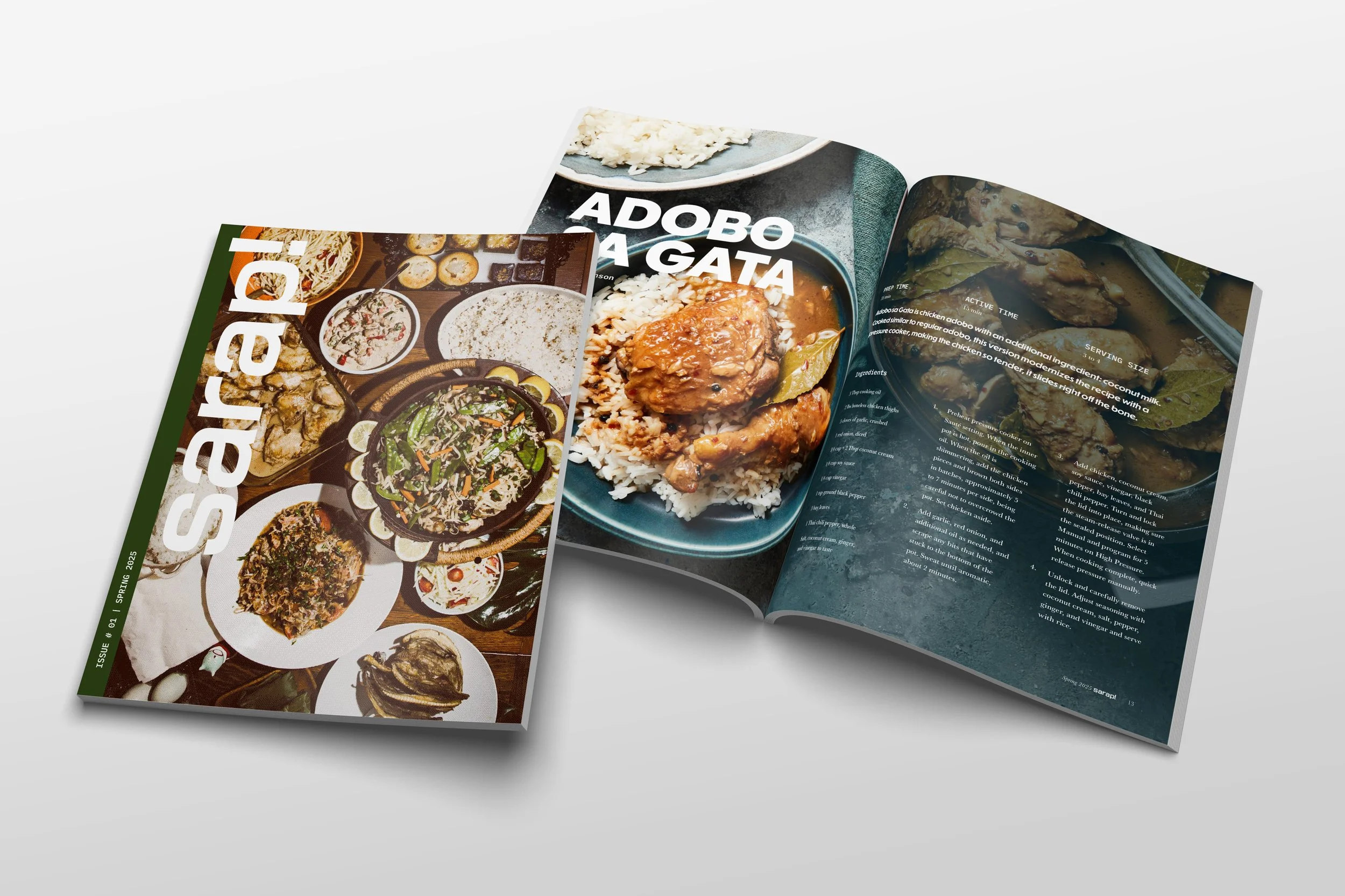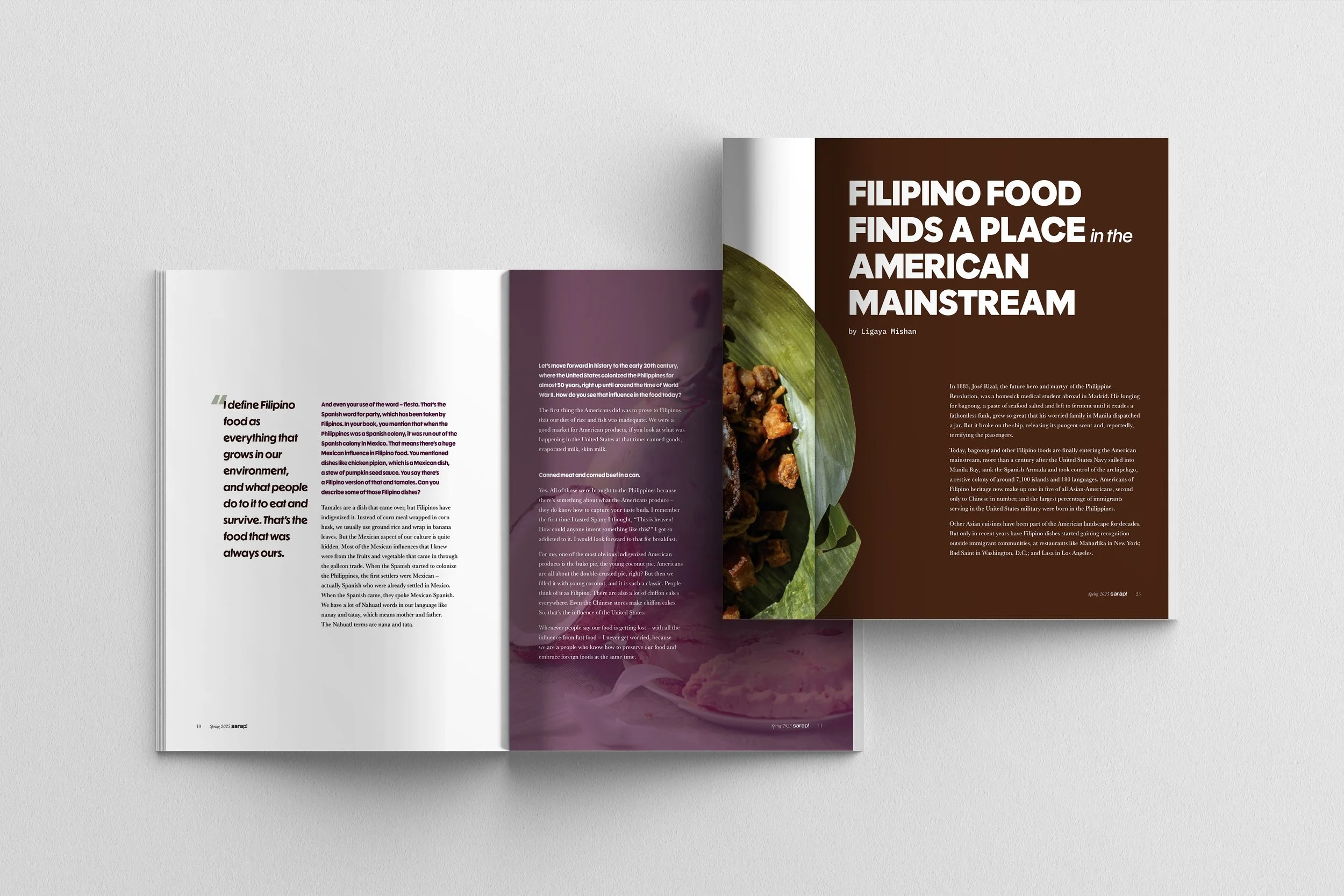 The aesthetic vision of Sarap! blends Philippine and American aesthetics, embodying the Filipino-American lens that drives the publication. The color palette features rich, earthy tones reminiscent of Filipino cuisine, with pops of color inspired by food packaging. The type and layout choices pull from more Western conventions, with sleek typography and grid-based spreads.
